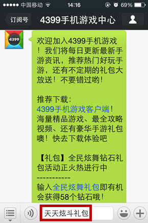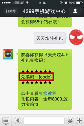 2.在4399手机游戏微信中,文字回复“天天炫斗礼包”,就可以收到兑换码哦!