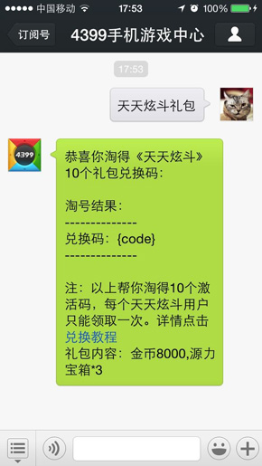 2.在4399手机游戏微信中,文字回复“天天炫斗礼包”,就可以收到兑换码哦!