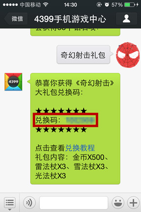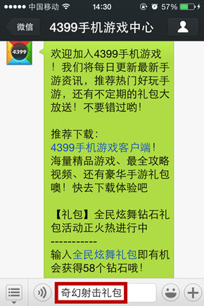 2.在4399手机游戏微信中,文字回复“奇幻射击礼包”,就可以收到兑换码哦!