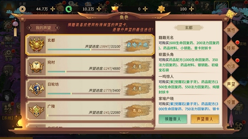 玄都所需的地区声望较多,建议少侠在升级某一地区声望到达对应的程度了,便可以将剩下的资源投入到玄都的声望系统升级中。日积月累,积少成多,这样能够帮助少侠的进阶条件同步达成。