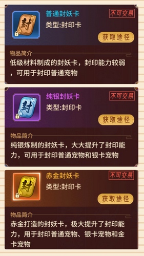 捕捉宠物的封妖卡共有三种:普通封妖卡、纯银封妖卡和赤金封妖卡。普通封妖卡只能封印能力较弱的普通宠物,而纯银封妖卡可用于封印普通宠物和银卡宠物,最后赤金封妖卡能够封印普通宠物、银卡宠物和金卡宠物。