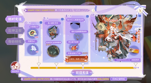 2026年1月9日~2027年1月7日,累计充值奇妙花宝达到12个月,即可在该时间段内享有花神之契特权。2027年1月7日22点后特权失效。