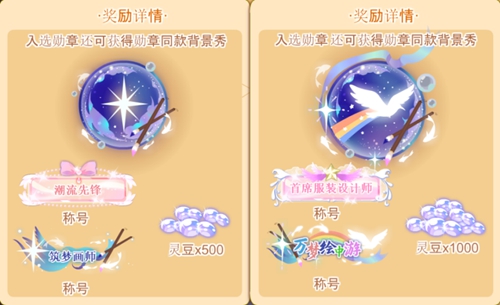 入选套装奖励:500灵豆、筑梦画师勋章、筑梦画师称号、潮流先锋称号