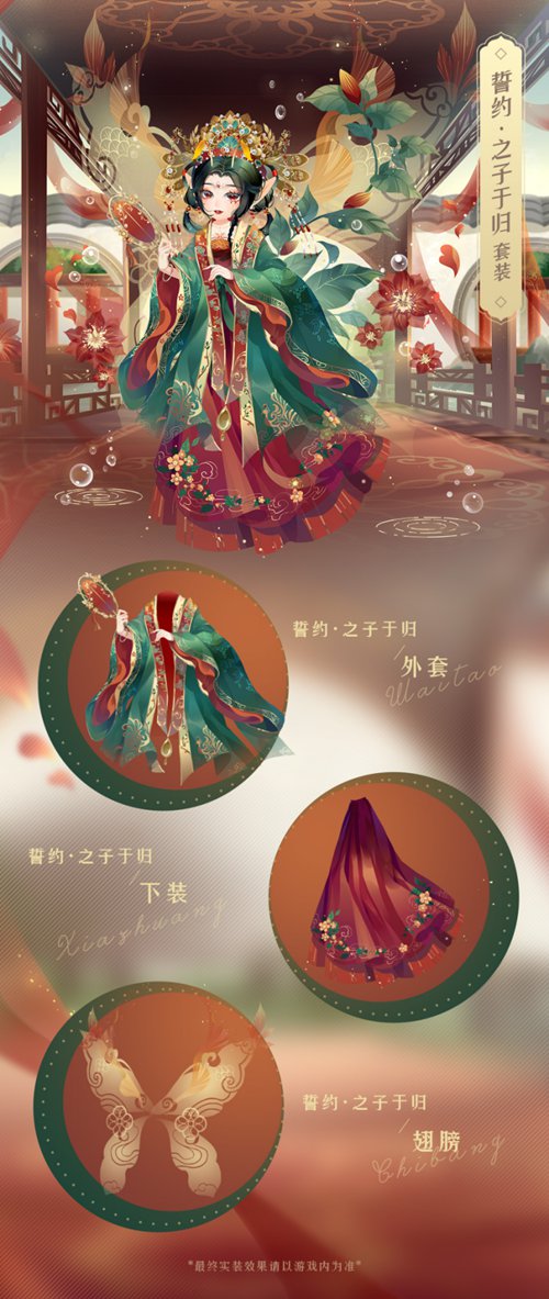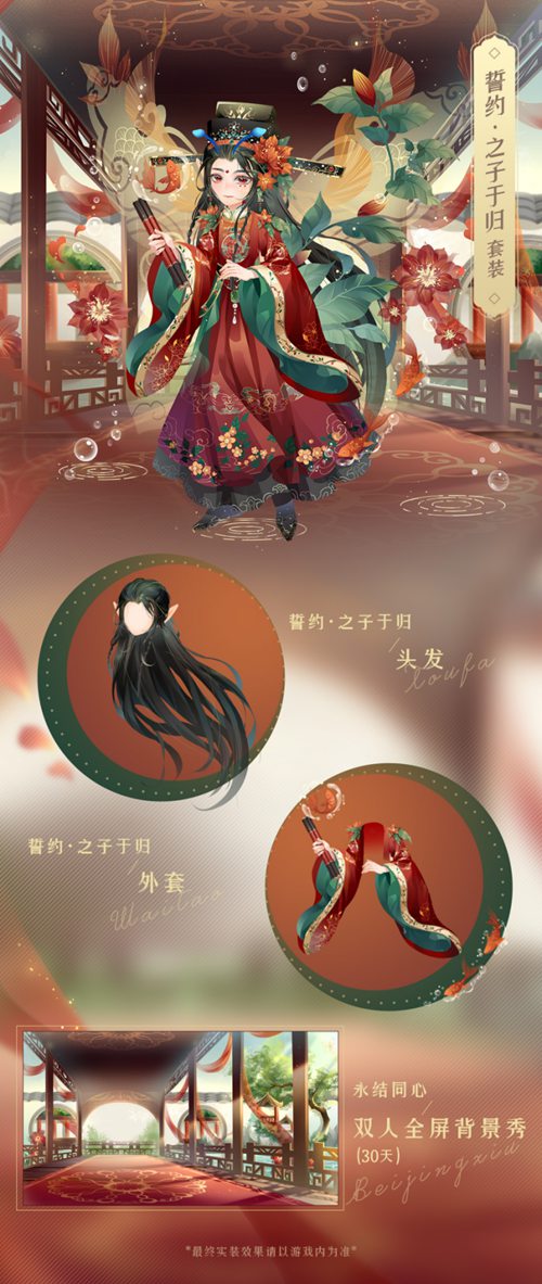 集齐【誓约·之子于归套装】【十里红妆背景秀装饰】即可领取奖:永结同心单人全屏背景秀(30天)、永结同心双人全屏背景秀(30天)