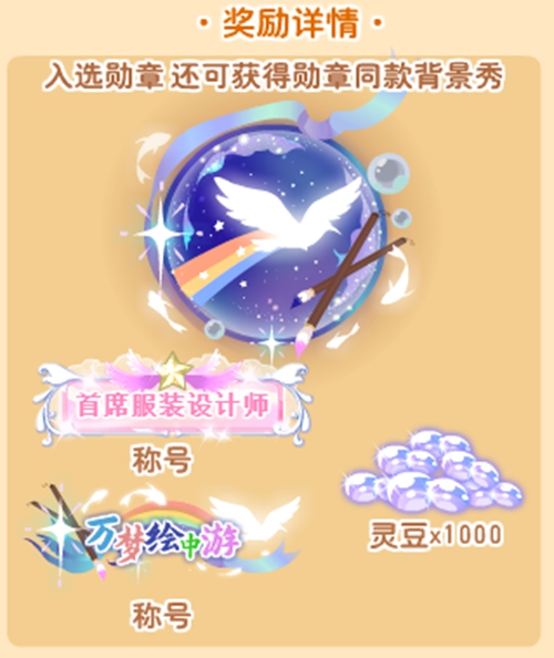 首席四强奖励:1000灵豆、万梦绘中游勋章、万梦绘中游称号、首席设计师称号