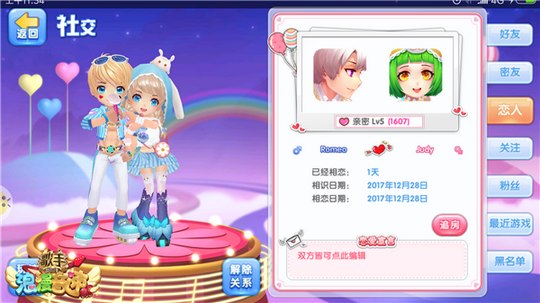 游戏全方位打造甜蜜交友社区,伙伴、密友、恋人、家族多重身份共建立体社交系统。关系的亲疏远近不同,共同游戏时获得的奖励加成不同,能进行的互动也不同,关系维护更有动力!还有独创的“双向fo”交友系统,好友关系一目了然。社区交友,把妹撩汉,聊天互动,玩的不亦乐乎!