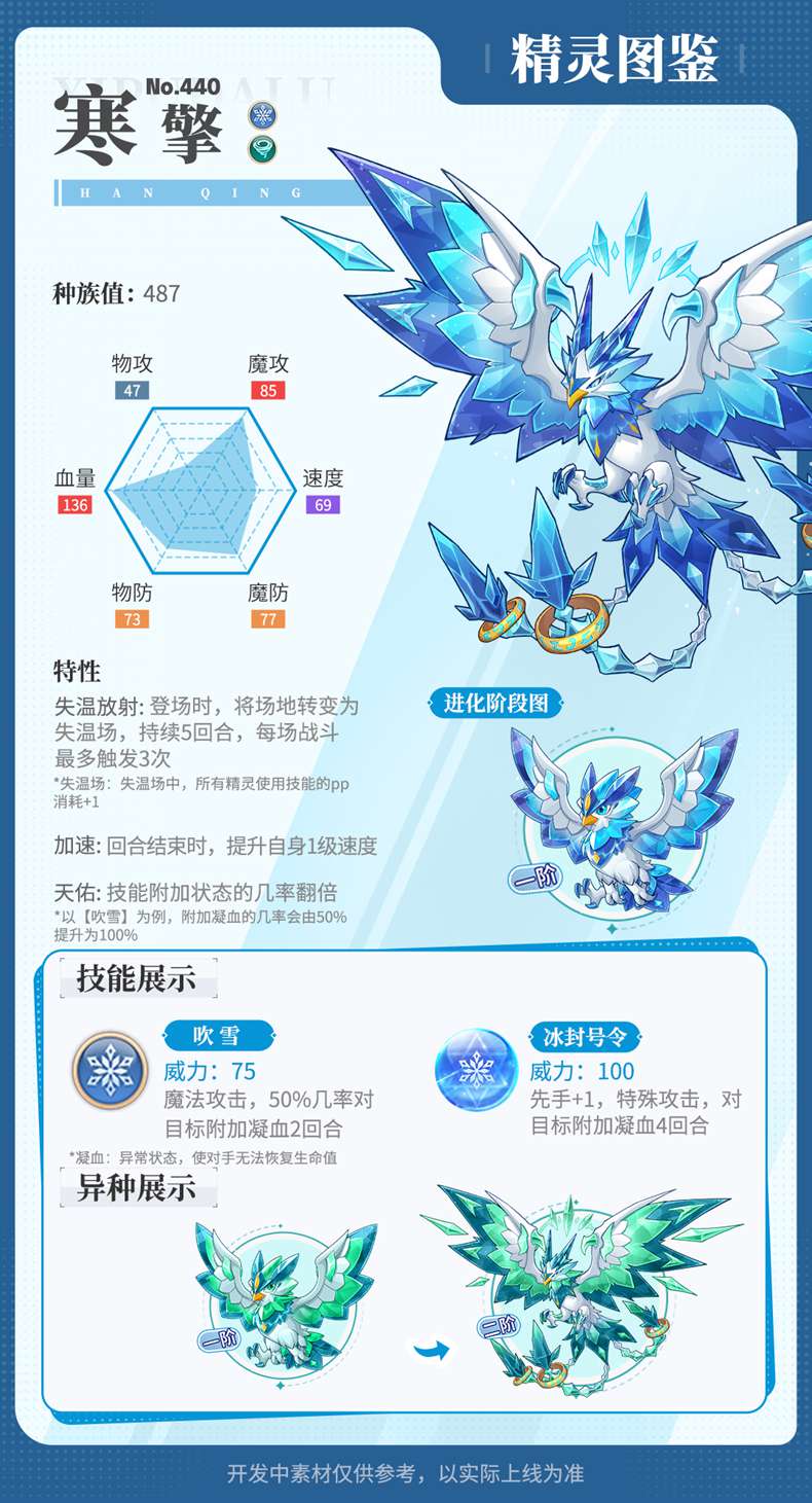 寒鸦,这类喜爱低温环境的精灵,是天气转冷之际便会现身于枝头的鸟类。每当寒冬降临,寒鸦便会振翅高飞,前往高山之上栖息生活。在进化后,寒鸦蜕变成为寒擎。寒擎是生活在云层之上的远古精灵,其拥有神奇而强大的能力,能够将空气中的水汽转化为冰棱。在那些富含水汽的区域,寒擎仿若拥有无尽的力量源泉,可肆意展现其独特而令人惊叹的冰系伟力,天地间书写属于自己的传奇篇章。