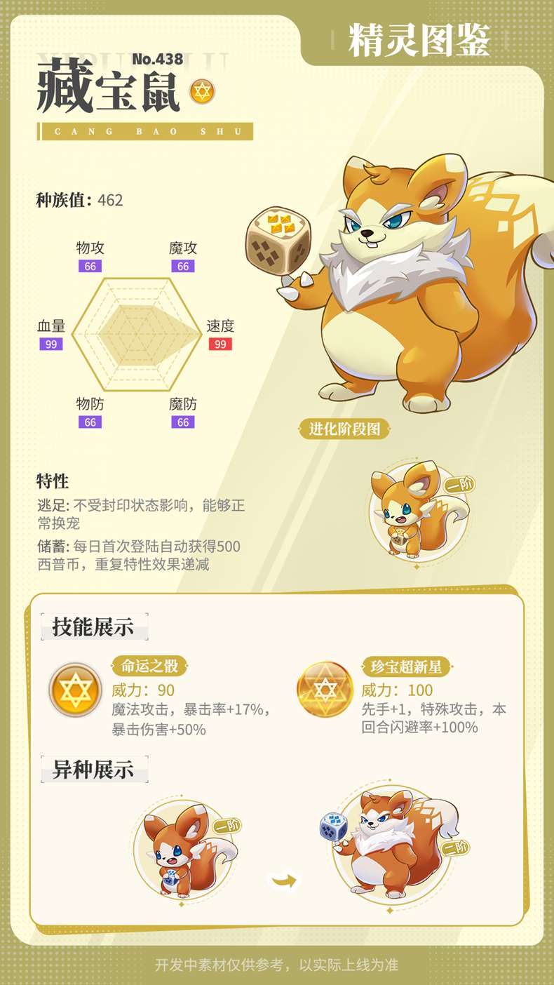 探宝鼠,这只独特的小精灵对闪闪发光之物情有独钟。它手持骰子,凭借骰子的点数来抉择自身的行动路径,以寻觅各处隐匿的宝藏为乐。在众多数字里,“4”被它视作幸运数字,它会精心挑选最珍贵的藏品用以装饰骰子的“4”这一面。蜕变为藏宝鼠后,性情变得有点古怪,时而展现出超乎寻常的大方,时而又显得格外小气。然而,若是有幸获得它的垂青与认可,必将收获极为可观的一笔巨额财富。