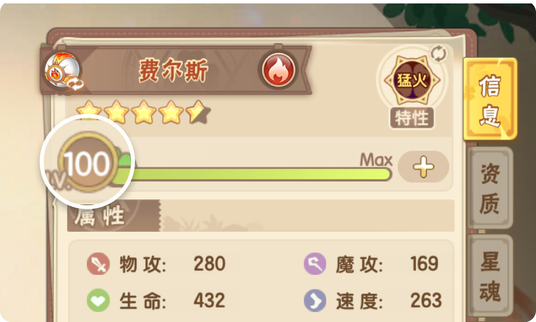 【精灵等级】在精灵信息页面中,可查看需要计算的精灵等级,精灵最高等级为100级。