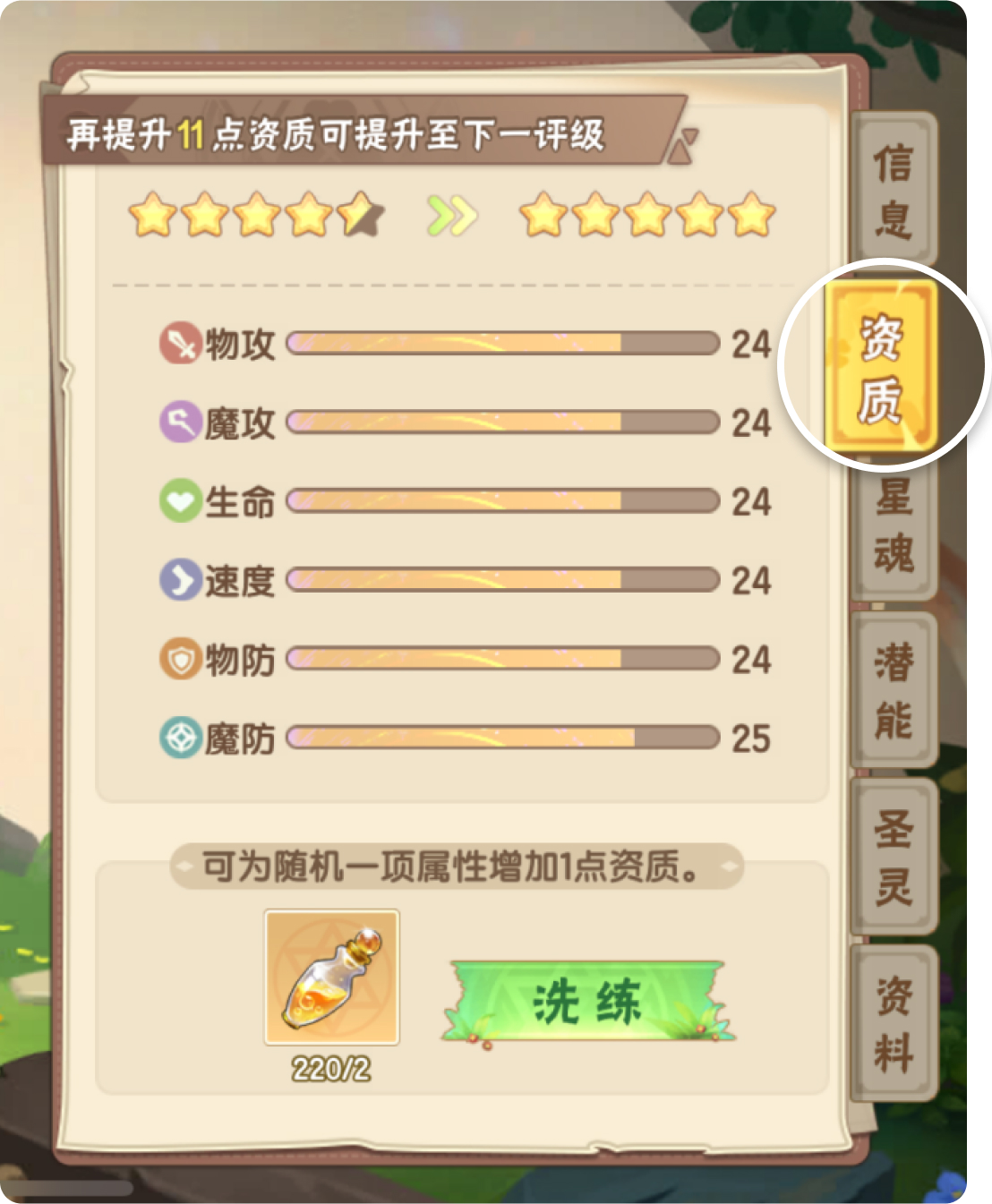 【资质】在精灵资质页面中,可查看每项资质数值,单条资质上限为31,使用资质药水可为随机一项属性增加1或2点资质。