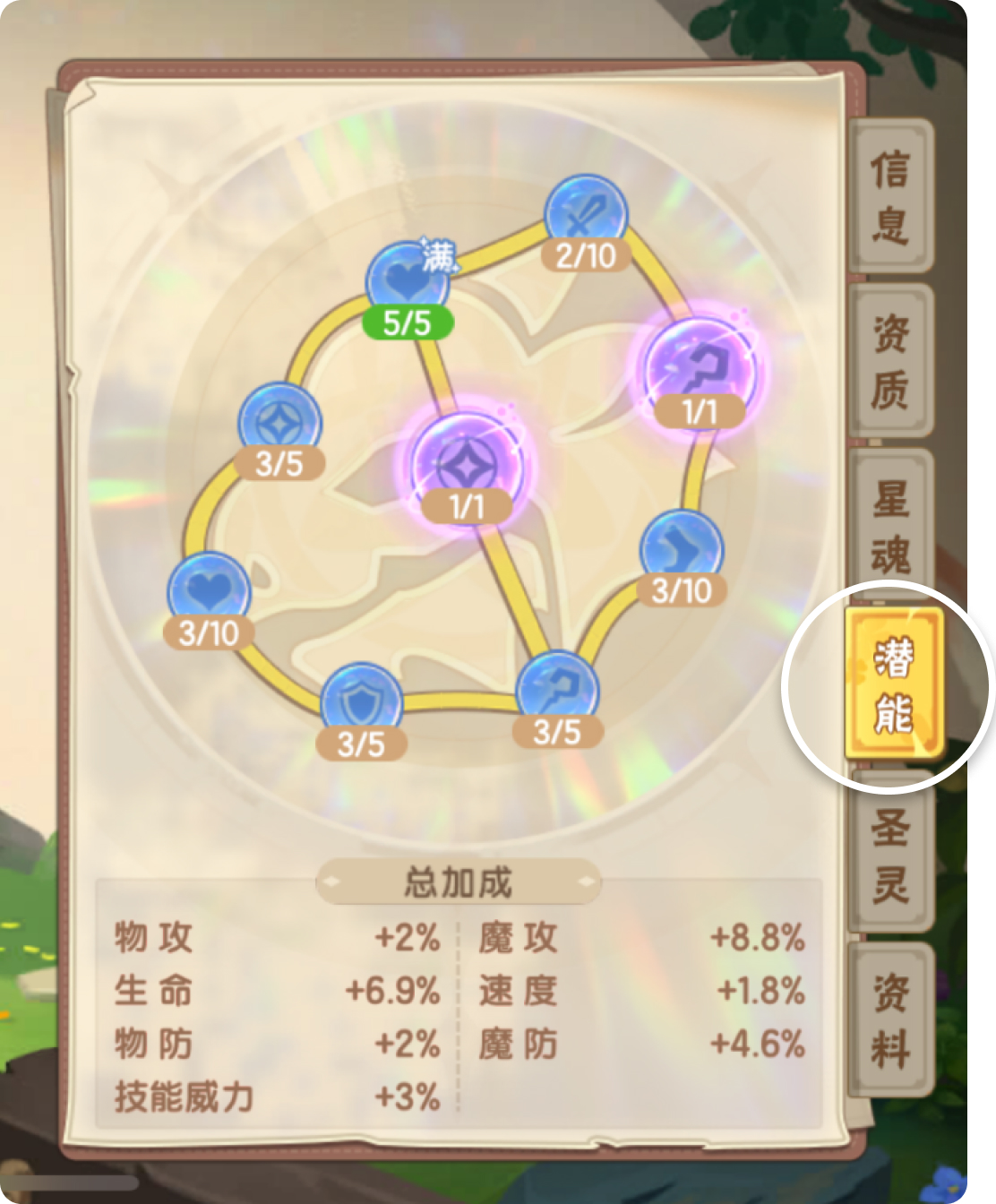 【潜能】在精灵潜能页面中,可查看当前精灵的潜能加成,精灵等级达到100级后开启潜能。不同系别的精灵会有不同的潜能图,根据计算器上方提供的潜能图点位,填入需要计算的潜能值。