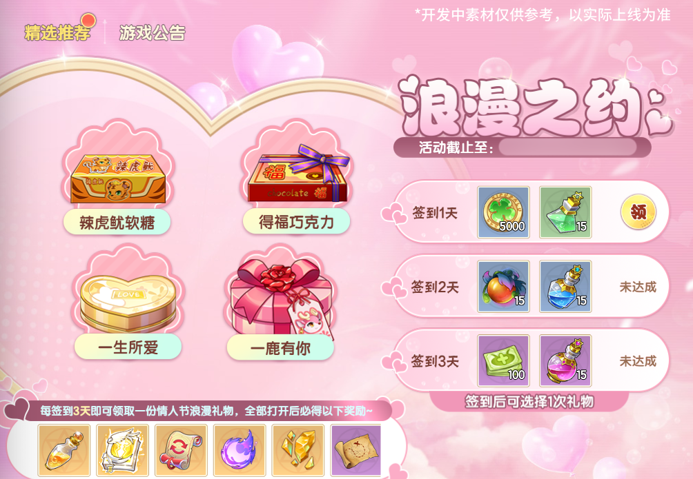 感谢一路有你,共赴浪漫之约,情人节签到活动上线,每签到3天还可选择一份情人节礼物。