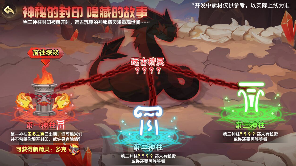 传闻远古可拉米创造了三柱神,当三神柱封印被解开时,远古沉睡的神秘精灵将重现世间……