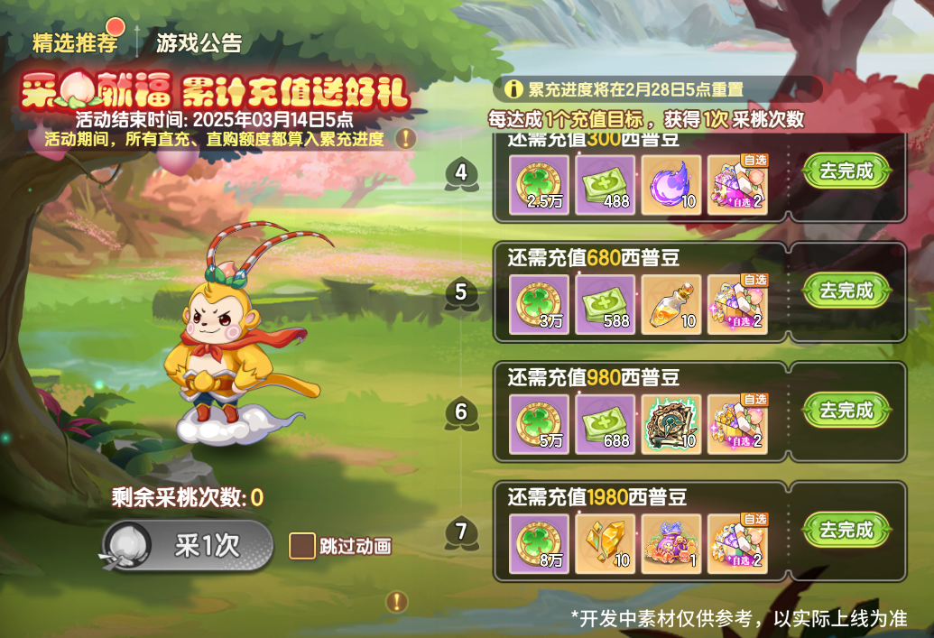 活动内容:累充送好礼,充值达到对应档次即可自选珍稀培养道具,活动累计开放4周,每两周将会重置1次。每达成一档位将获得1次采桃次数,有概率获得西普豆以及点券。