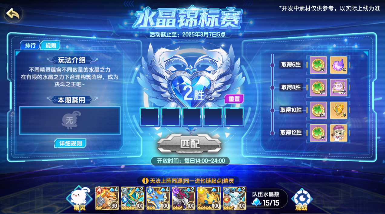 活动内容:全新水晶锦标赛上线,不同精灵蕴含着不同数量的水晶之力,在有限的水晶之力下合理构筑阵容,成为决斗之王吧!每轮有5次失败机会,获得胜利后可得封灵碎片、资质药水等奖励,单轮取得12次胜利还可激活竞技场特殊表情——得意。