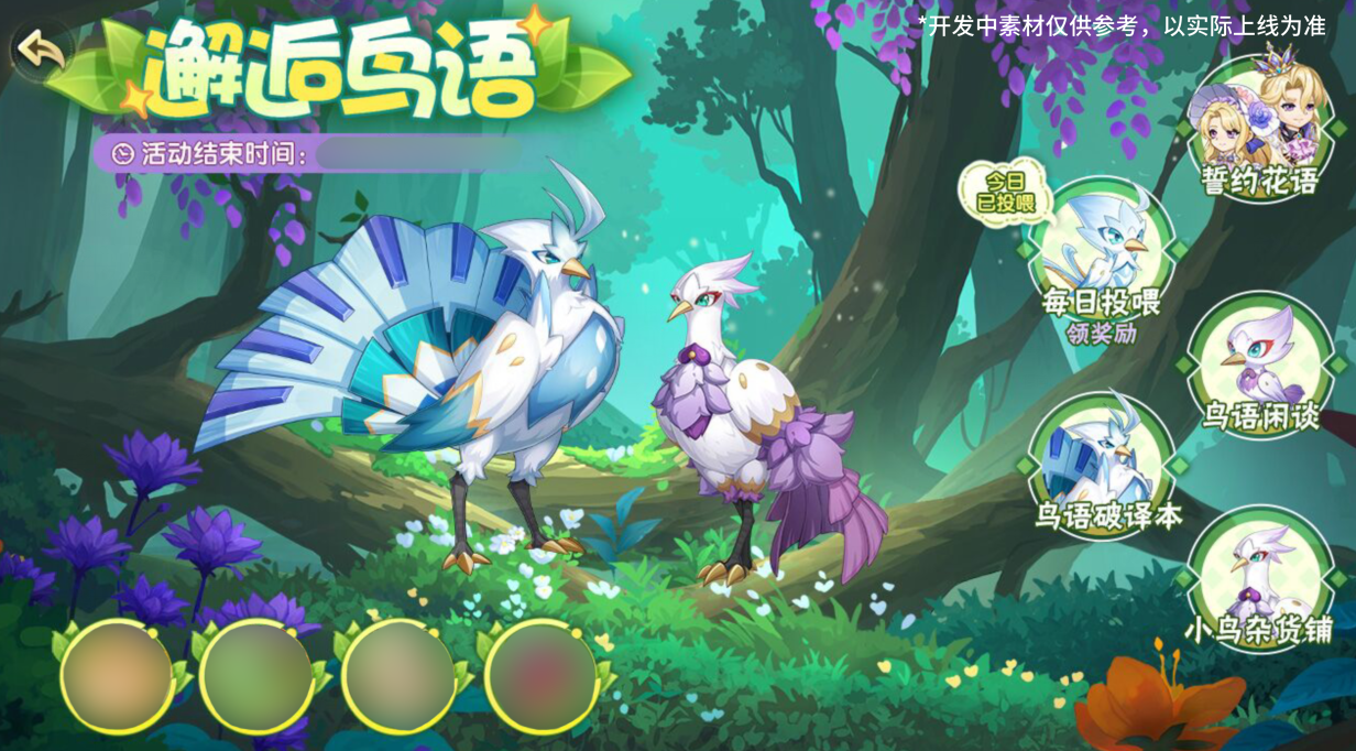 活动内容:通过参与每日投喂活动获得绿豆,可获得捕捉精灵的机会;参与鸟语闲谈、鸟语破译本活动获得红豆,可以在小鸟杂货铺中兑换道具奖励。