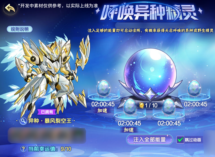 小西普们可通过完成日常任务获取能量,并将能量注入法阵。每次注入足够的能量即有概率孵化出[天启呼唤]异种精灵或野生精灵。孵化精灵蛋时,若未出现异种精灵将获得1点幸运值,幸运值达到10时,必得[天启呼唤]异种精灵及其进化道具。每获得1只[天启呼唤]精灵,幸运值将清零重新计算,已获得的异种精灵不会重复获得。