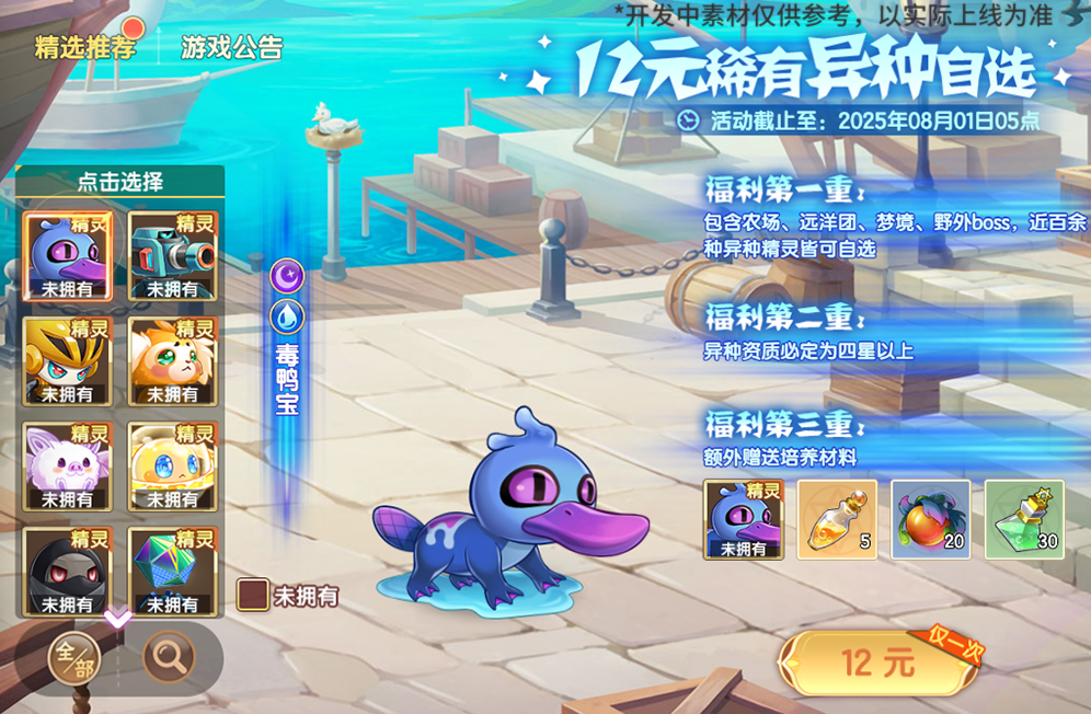 稀有异种自选,小西普们可选择购买自己喜爱的异种精灵,精灵保底4星资质,还有超值成长礼包相送。