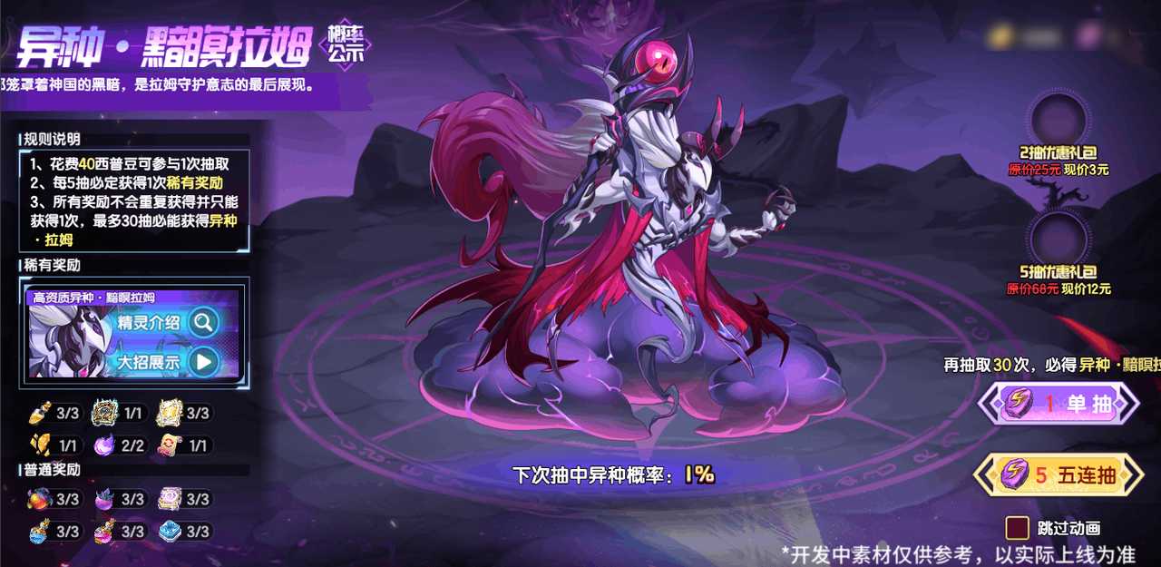 花费西普豆可参与一次补给抽取,每次抽取将有机会获得大型经验果、蓝之星纹、紫色星魂秘药等普通奖励或异种精灵·黯瞑拉姆、资质药水、同源置换卷轴等稀有奖励,抽取5次必定获得1次稀有奖励。除此之外,还为小西普们准备了超值2抽以及5抽优惠礼包!此次异种精灵·黯瞑拉姆的专属绝招特效也将同步上线。
