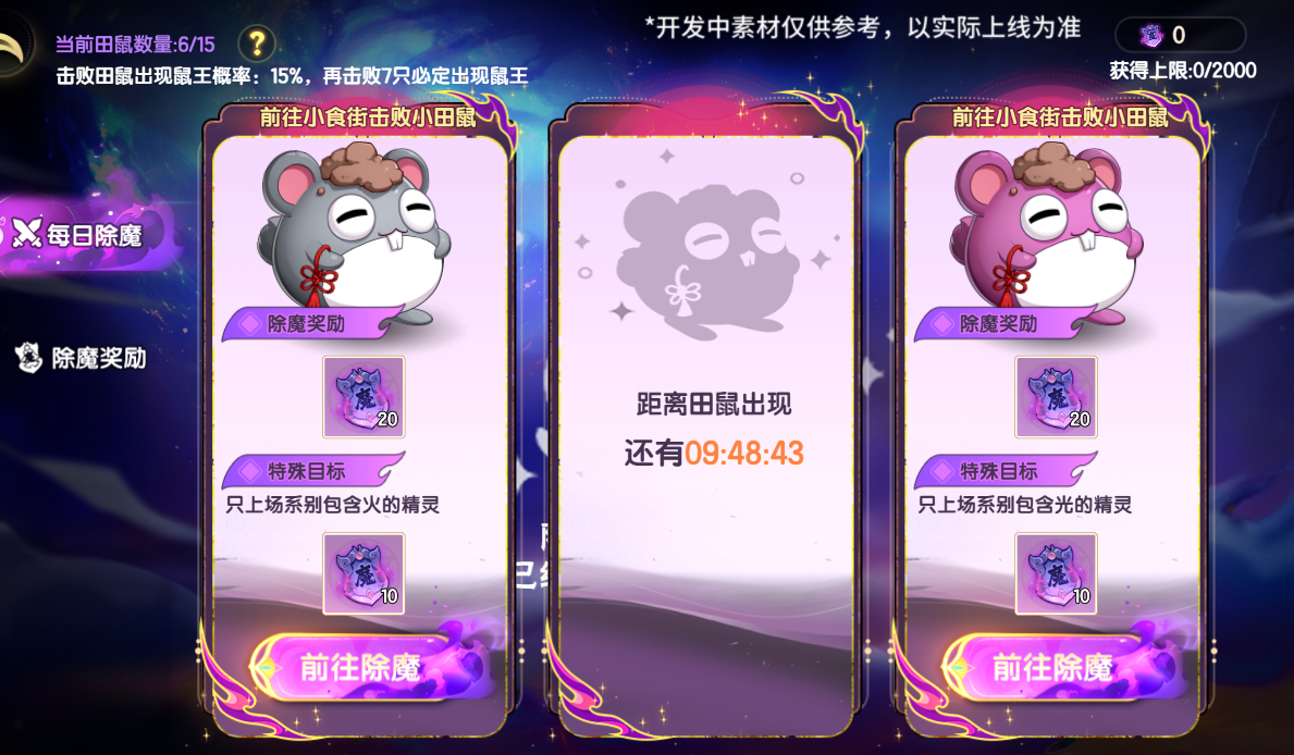 ③除魔令获取数量设有上限,活动期间获取总上限为2000,超过上限后会继续出现小田鼠,击败后会继续出现田鼠王,击败后仍可获得道具奖励但不可再获得除魔令;