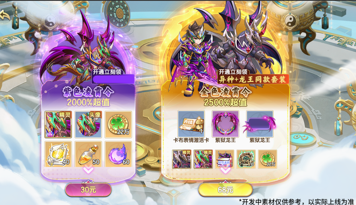 ②紫色凌霄令:活动期间,购买紫色凌霄令即可获得联动精灵·紫狱龙王(随机3~5星资质),完成任务提升通行证等级还可以领取西普币、全知秘典、资质药水、灵源等奖励;