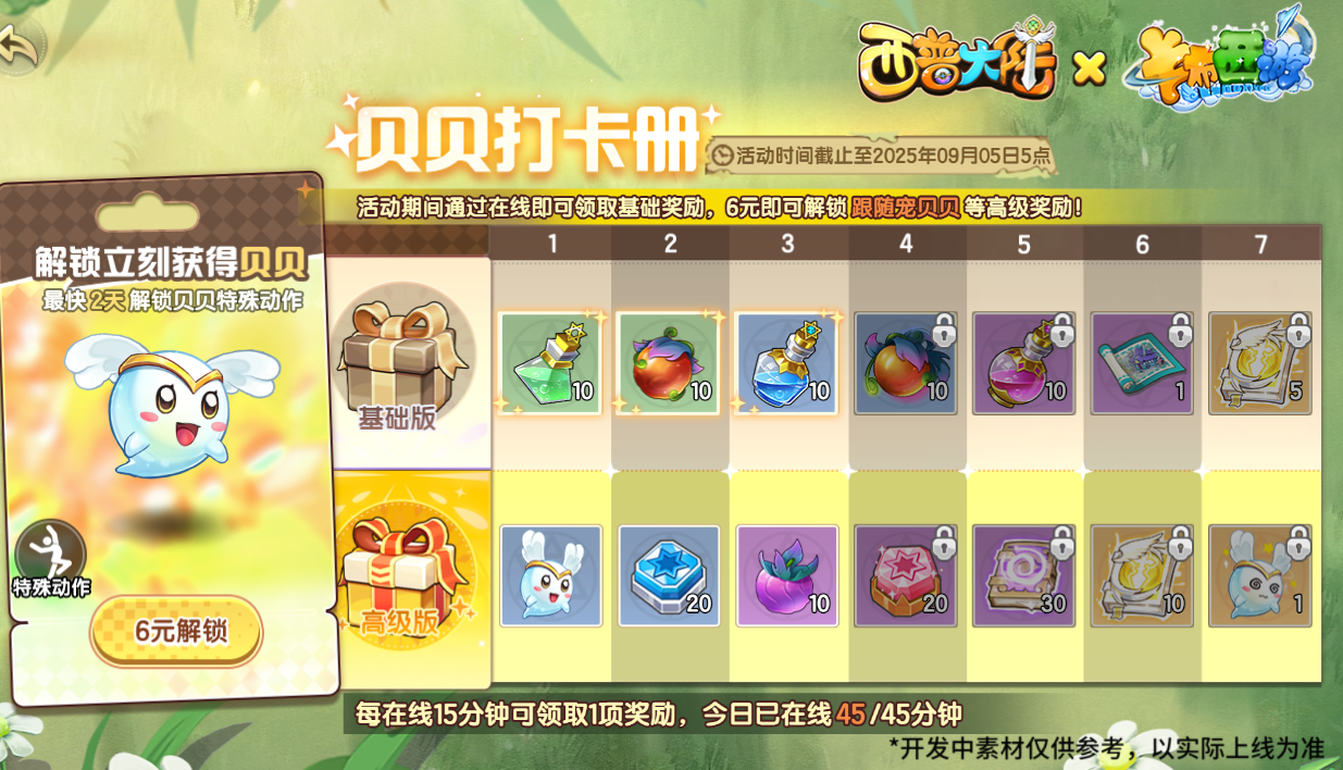 联动开启,快来和贝贝一起参与打卡吧!活动期间通过累积在线时长,即可免费领取星魂秘药、经验果等基础奖励;解锁高级版打卡册即可获得联动跟随宠·贝贝,累积在线时长还可以获得贝贝特殊动作、启慧之书、全知秘典等高级奖励。每日最多可激活3项奖励,最快2天即可获得全部奖励。