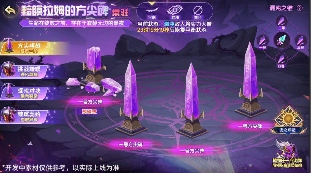 参与黯瞑拉姆活动,摧毁任意一座方尖碑,可获得拉姆(一阶),摧毁四座方尖碑,即可挑战黯瞑拉姆。击败黯瞑拉姆,可获得培养道具与黯瞑拉姆的进化晶核。获得黯瞑拉姆后,在混沌对决中通过十关可获得专属头像框等奖励。