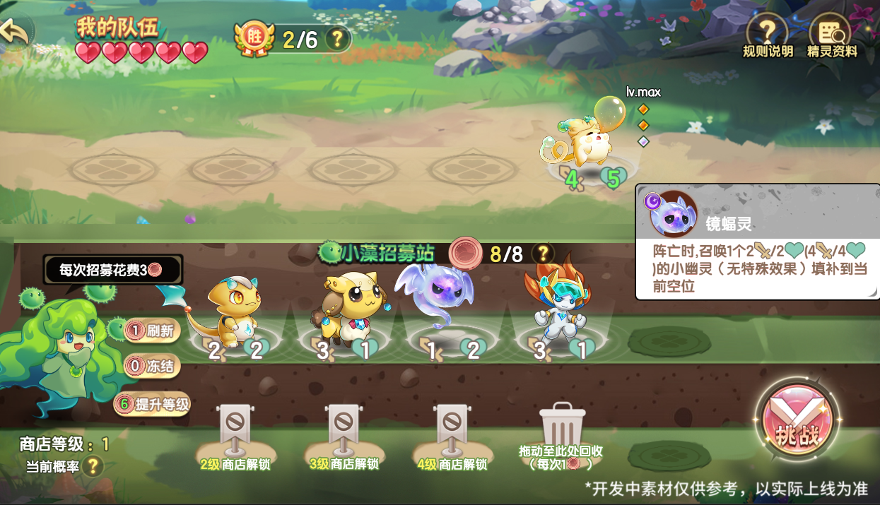 除了游玩每日更新的关卡外,也可以选择挑战赛迎战其他小西普的阵容,小精灵们都有专属的能力,合理搭配能力和分配货币消耗是取胜的关键!