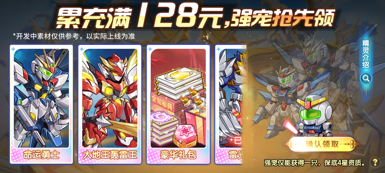历史累计充值金额达到128元的小西普们,即可从雷光狼王、真雷雨闪电蝎、暗影狼王、大地轰雷王、命运勇士中,抢先领取任意一只精灵及其进化晶核。
