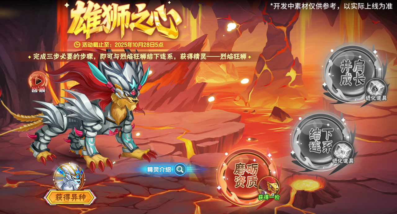 完成磨砺资质、结下连系、并肩成长,即可获得精灵·焰小狮以及烈焰狂狮进化晶核。