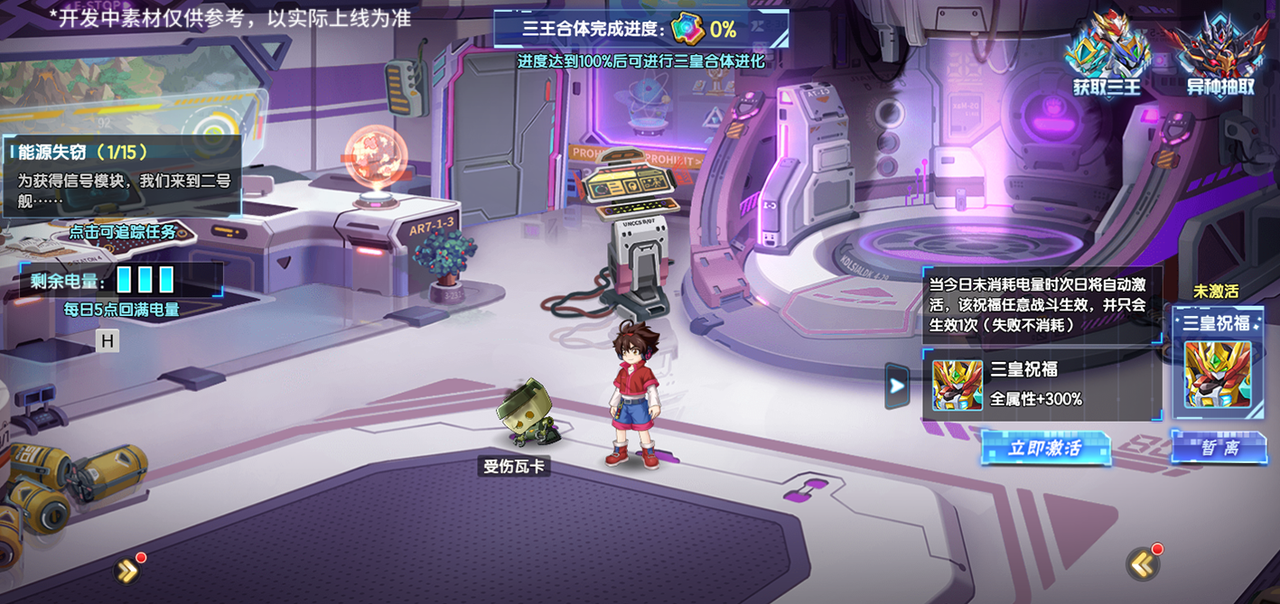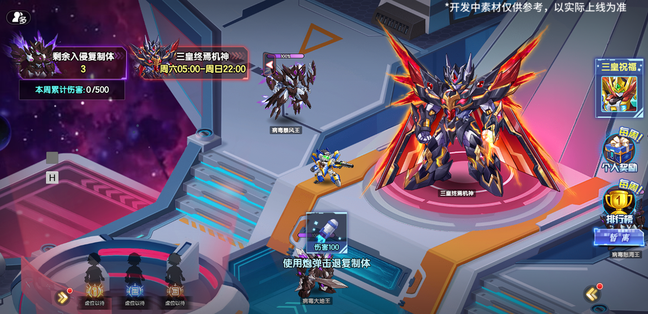 诺亚方舟能源失窃,陷入危机,拜托小西普们一起击败三皇终焉机神,夺回核心能源,拯救诺亚方舟。参与挑战三皇终焉机神,每周登上排行榜的小西普们还可获得——封灵碎片。