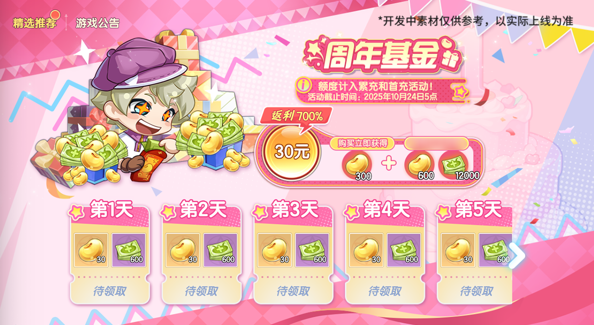 周年基金上线!激活基金,即可立刻获得西普豆*300,累计签到20天,还可再领取西普豆*600以及点券*12000。