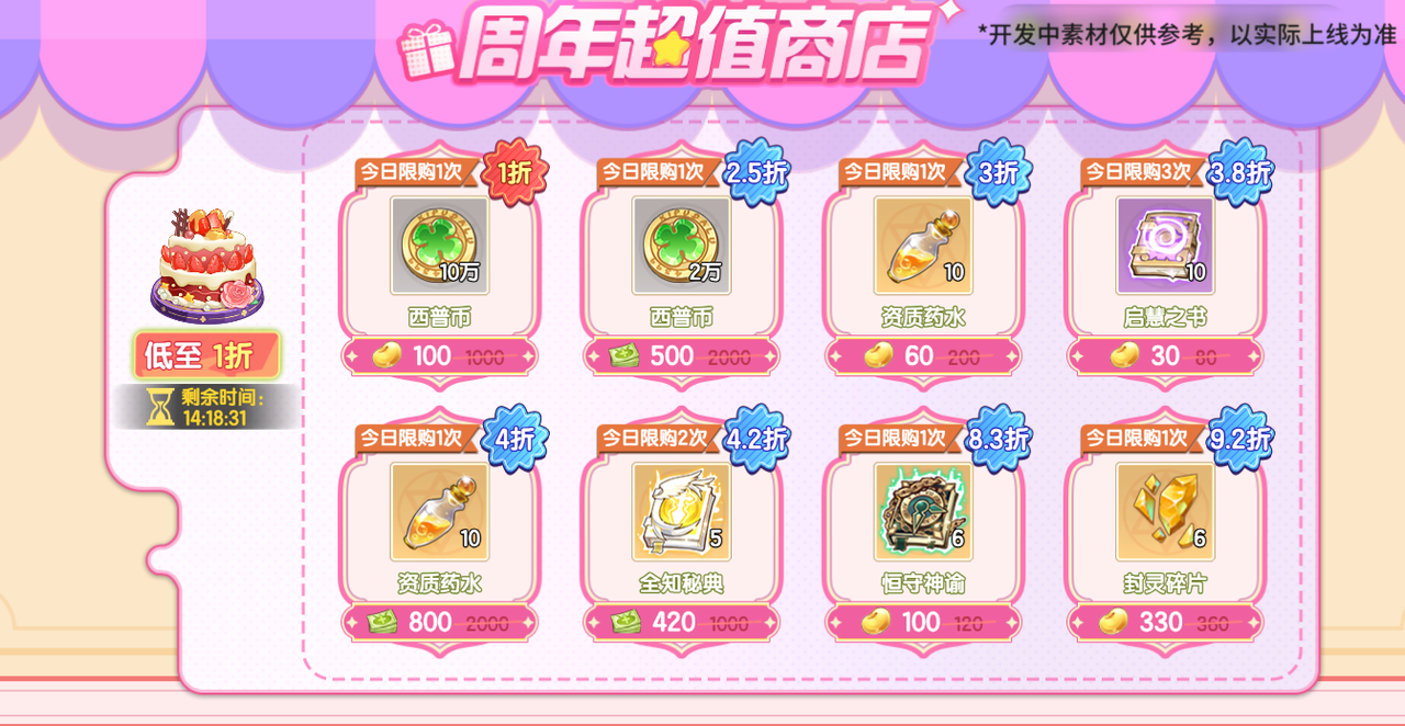 今日甜品小店开业,每日随机抽取折扣(最低1折)。小西普可以在商店内以折扣价购买需要的培养礼包,不同道具会有不同的折扣优惠,更有惊喜的1折道具哦!部分道具支持点券购买,机不可失!