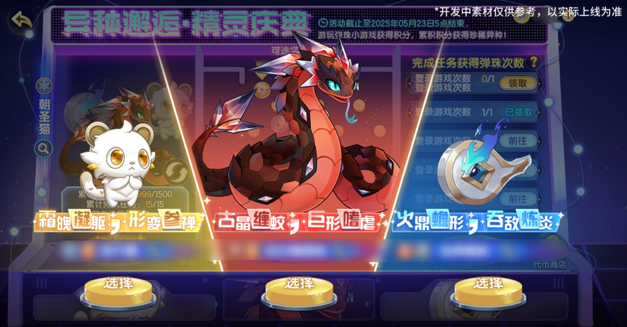 完成每日任务可获得弹珠发射次数,发射弹珠获得代币,累积对应数量的代币即可自选兑换一只一阶珍稀异种精灵(爆晶蛇、朝圣猫或金钱蝌),此外代币还可用于兑换其他培养道具。