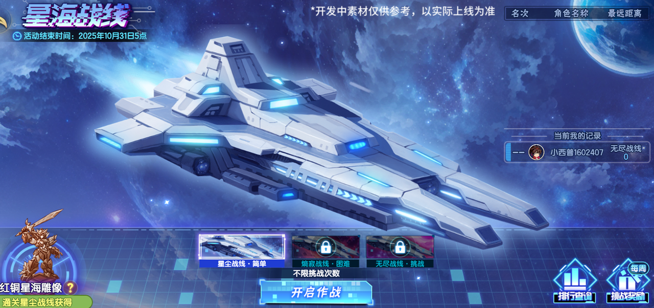 无尽星海之中存在许多未知的挑战与冒险,只有勇敢的冒险家才能征服这片星尘大海,选择你的小伙伴一起前往宇宙冒险,看看你们能探索多远吧!无尽战线挑战的奖励每周重置刷新并会参与排行,挑战排行榜在10月31日结算,可获得启慧之书、全知秘典和纪念拼图——数码拼图。