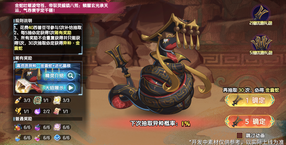 花费西普豆可参与一次补给抽取,每次抽取将有机会获得大型经验果、蓝之星纹、紫色星魂秘药等普通奖励,或异种精灵-金囊蛇、资质药水、同源置换卷轴等稀有奖励,抽取5次必定获得1次稀有奖励。除此之外,我们还为小西普们准备了超值2抽以及5抽优惠礼包!此次异种精灵-金囊蛇的专属绝招特效也将同步上线。