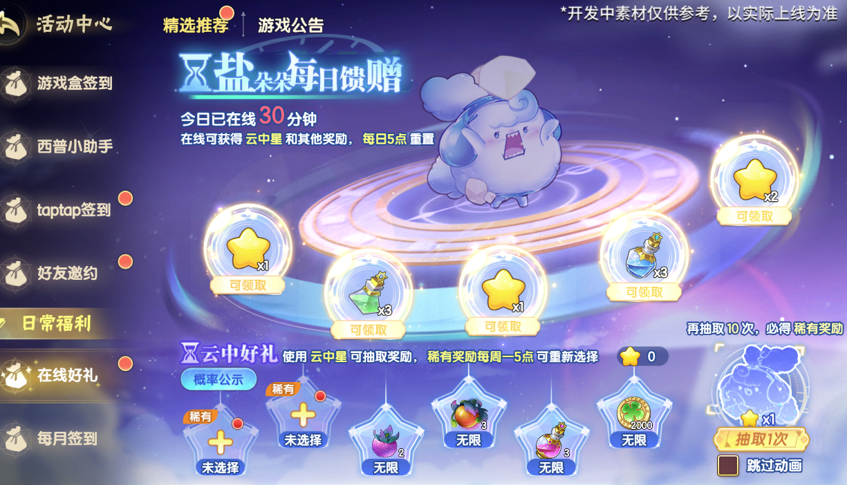 新增云中好礼功能,小西普每周可选择2个稀有奖励,选择后消耗道具(云中星)进行奖励抽取,有机会获得稀有奖励!(每抽取10次,必得稀有奖励)稀有奖励和道具云中星都在每周一5点清空重置。