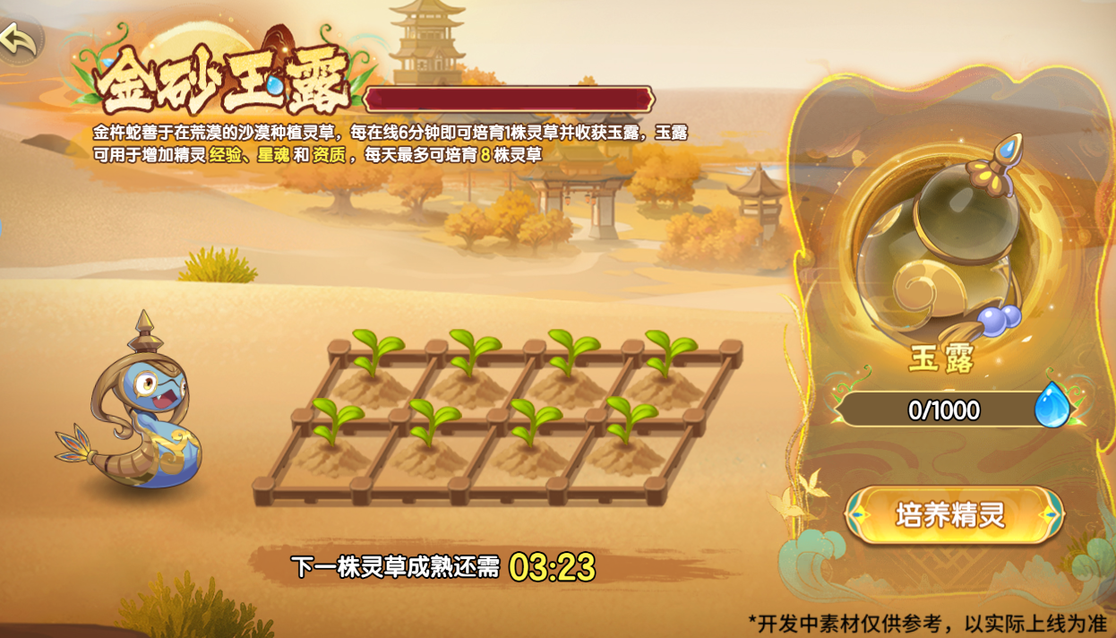 金杵蛇善于在荒漠中种植灵草,每在线6分钟即可成功培育一株灵草并收获玉露,玉露可用于增加精灵经验、星魂和资质,每天最多可培育8株灵草。