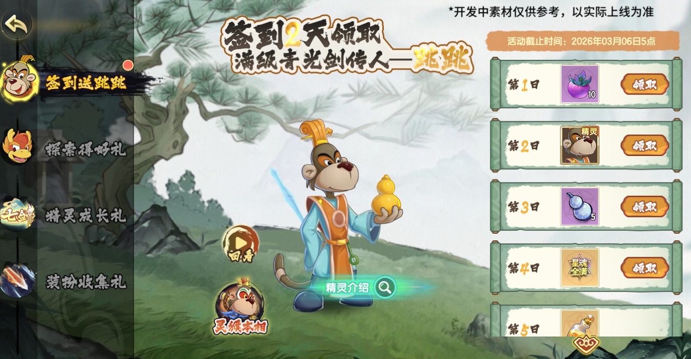 每日登录打卡可领取相应的奖励,累计签到2天即可免费领取联动精灵·跳跳,累计签到7天,还能帮跳跳习得专属技能“风驰电掣诀”。