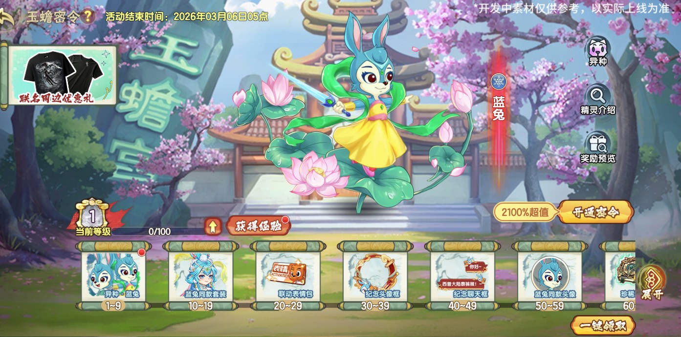 联动专属通行证上线!活动期间内,购买紫色密令即可获得联动精灵·蓝兔(随机3~5星资质);购买金色密令可获得异种·蓝兔(随机4~5星资质),完成相应的密令任务,还可解锁奖励蓝兔衍生服饰【冰魄飞袖】礼盒、联动纪念头像框、联动表情卡等。