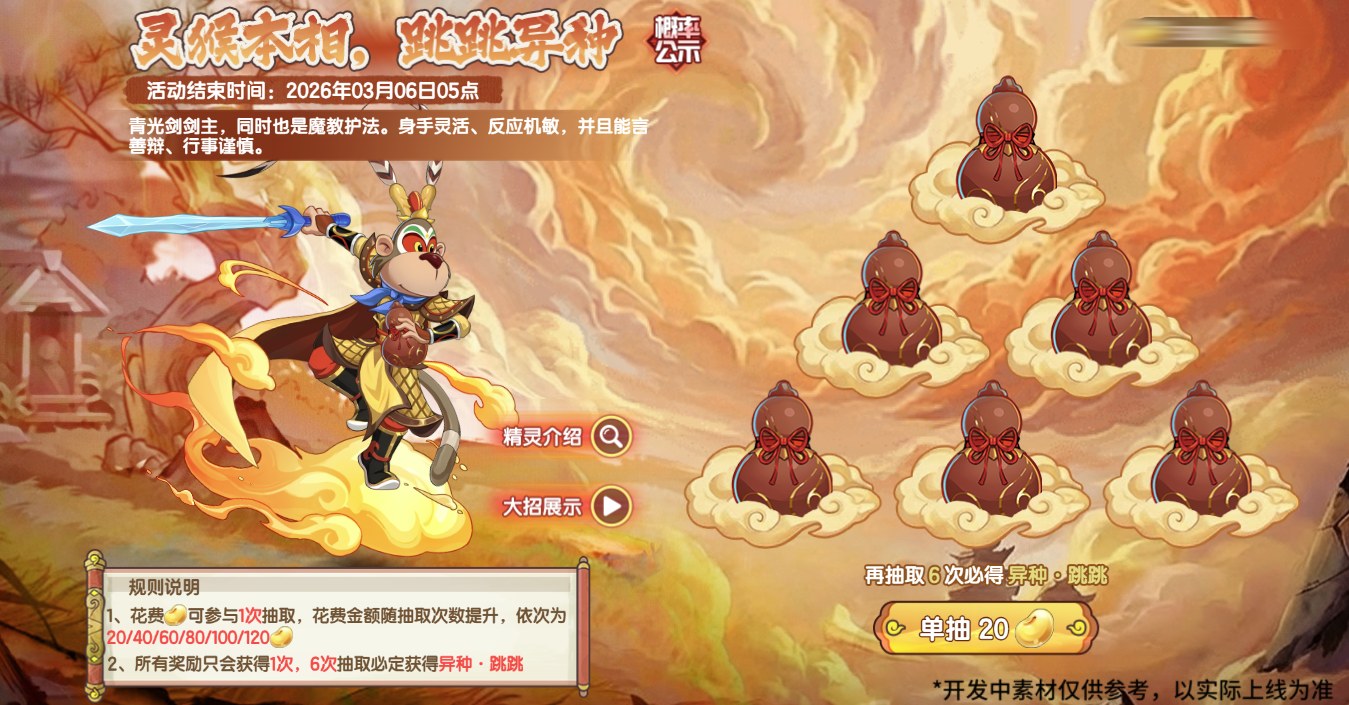 异种获取:花费西普豆可参与一次抽取,每抽取一次所花费西普豆的金额将随抽取次数提升。每次抽取将有机会获得异种精灵·跳跳、资质药水、封灵碎片等奖励,所有奖励只有一次获取机会,6次抽取必定获得异种精灵·跳跳。