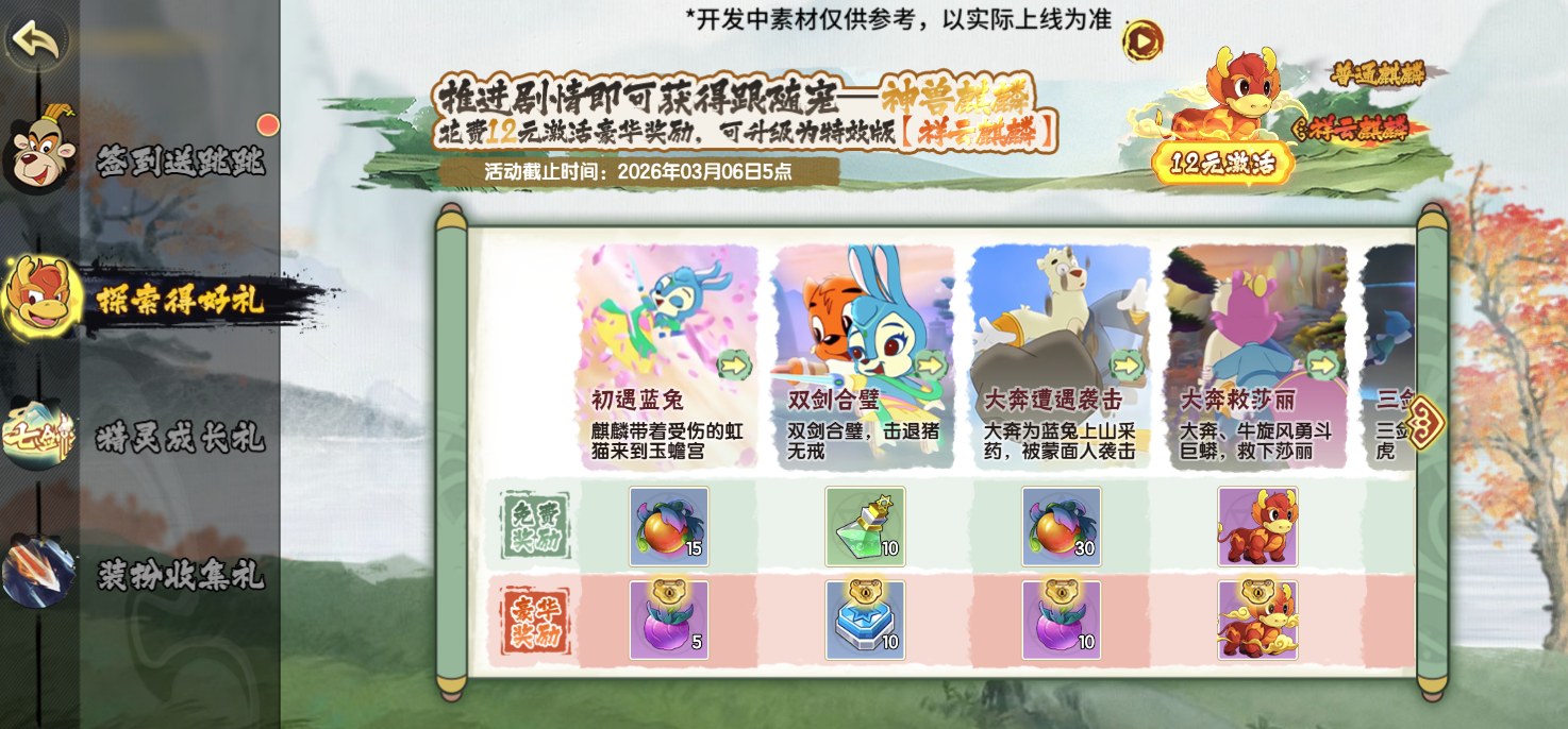 亲历动画经典剧情,完成相应的主线任务,即可获得跟随宠·麒麟。激活豪华奖励,还可获得联动跟随宠·祥云麒麟。