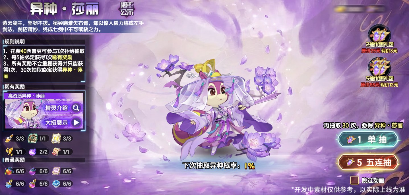 异种获取:花费西普豆可参与一次补给抽取,每次抽取将有机会获得大型经验果、蓝之星纹、紫色星魂秘药等普通奖励,或异种精灵·莎丽、资质药水、同源置换卷轴等稀有奖励,抽取5次必定获得1次稀有奖励。除此之外,还为小西普们准备了超值2抽以及5抽优惠礼包!异种精灵的专属绝招特效也将同步上线。