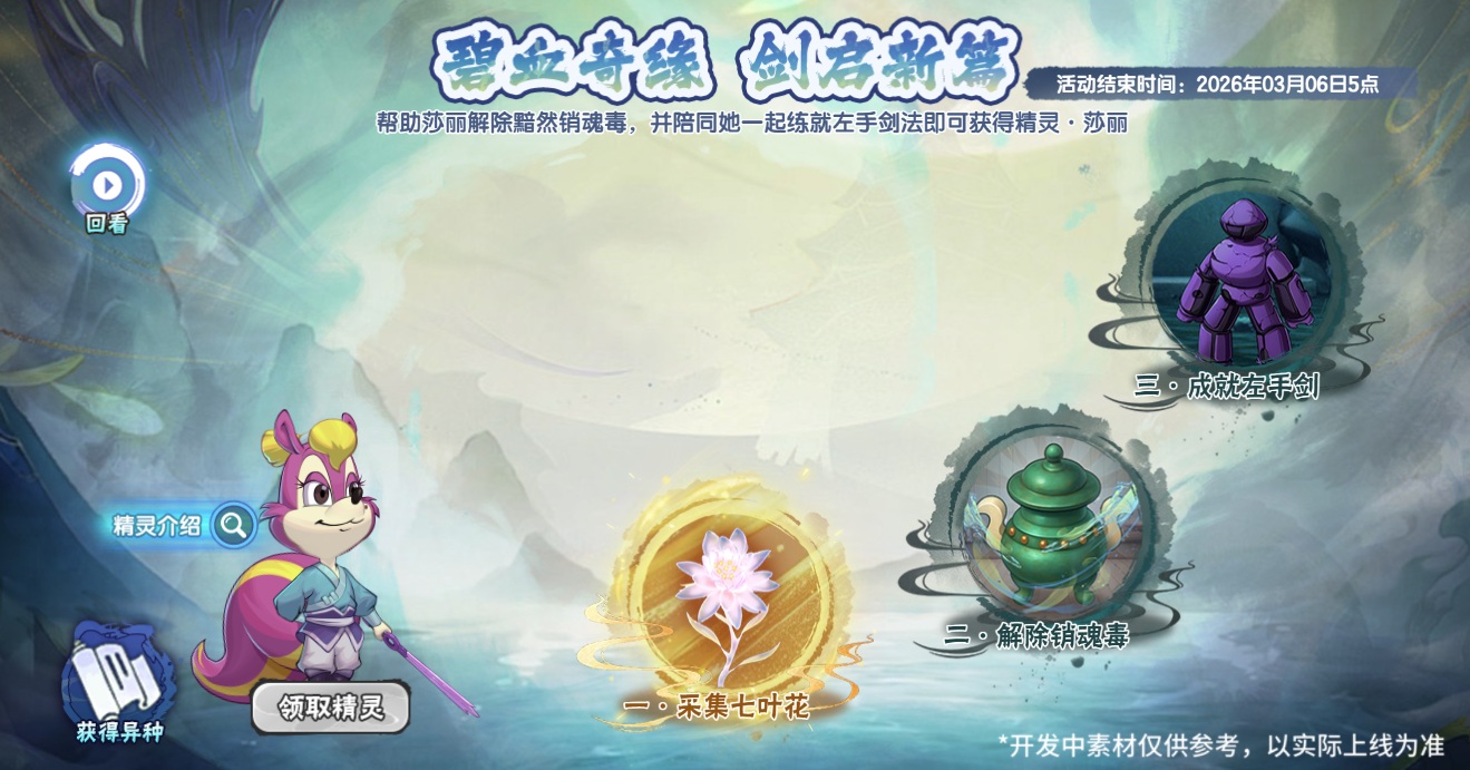 化身神医,采集七叶花,探寻药谷搜集辅材,调配药方为莎丽祛除体内四重毒素。陪伴莎丽前往独臂剑冢,与她并肩作战通过10层机关人试炼,练就绝世“左手剑法”。完成活动即可免费获得联动精灵·莎丽!