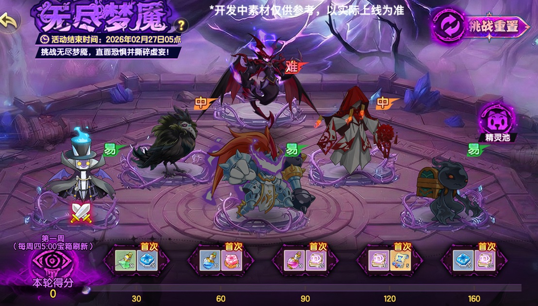 挑战无尽梦魇,直面恐惧并撕碎虚妄!活动期间内每周将轮换6位挑战对手,使用系统提供的精灵搭配组合,击败对手获取积分可解锁当周进度宝箱,挑战要点: