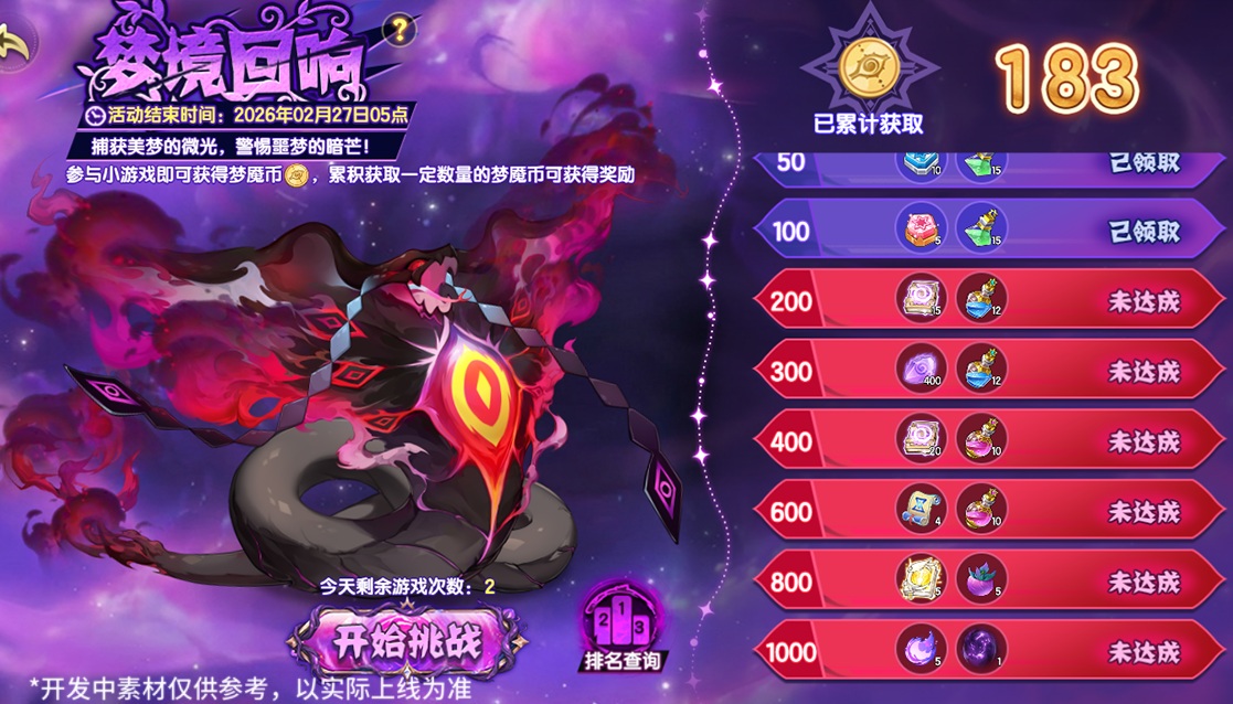 梦魇具现:迎战孵化具现的梦魇蛇魔,梦魇蛇魔的孵化进度决定了挑战难度。