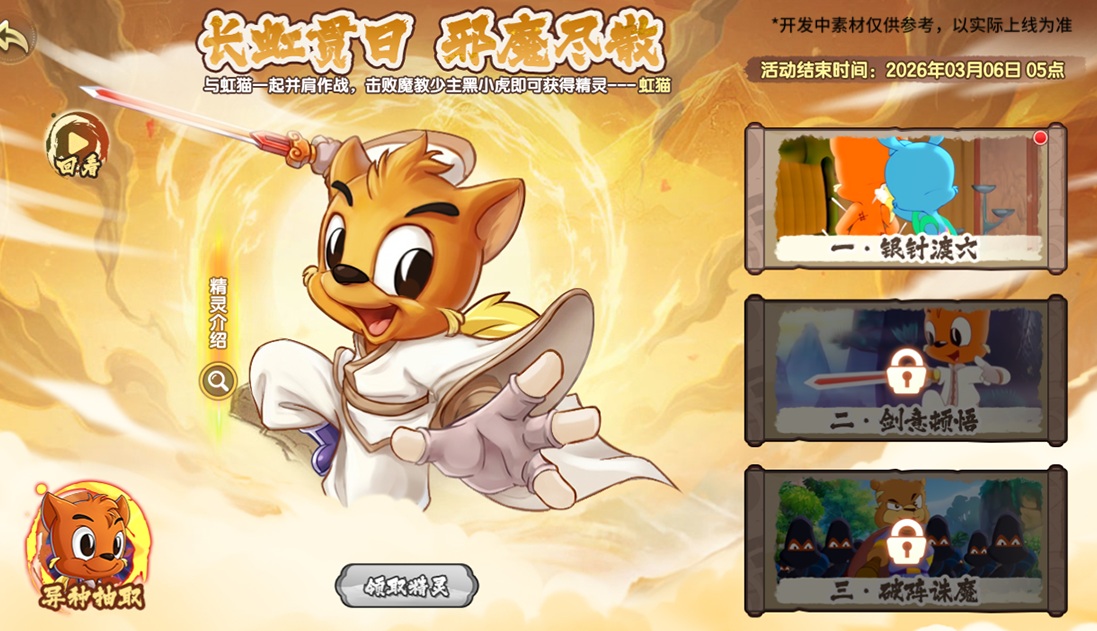 魔教少主黑小虎卷土重来,快来协助虹猫少侠去除身体毒素并恢复功力!参与银针渡穴、剑意顿悟以及破阵诛魔活动,击败魔教教主黑小虎即可获得精灵·虹猫。