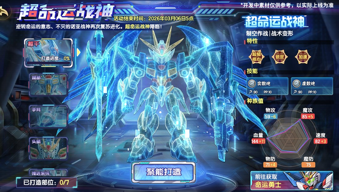 逆转命运的意志、不灭的诺亚战神再次复苏进化!活动期间每天可登录进行聚能打造,完成7个部件打造即可获得超命运战神进化道具,若拥有异种·命运勇士在完成部件打造后还可额外领取1个进化道具。