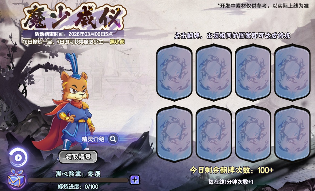 魔教少主——黑小虎登场!活动期间内,将根据小西普的每日在时长,获得修炼(翻牌)次数,翻出两张图案相同的卡牌,即可增加修炼经验。每日可修炼一层,将黑小虎的独门绝学“黑心煞掌”修炼至七层,即可获得精灵·黑小虎。