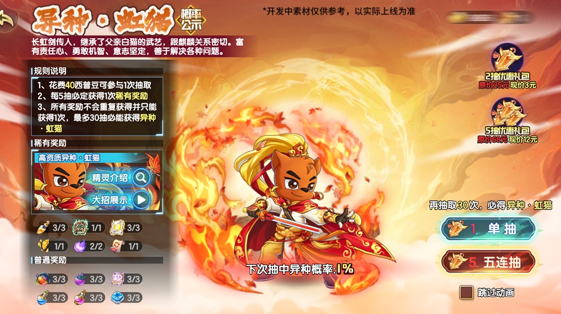 花费西普豆可参与一次补给抽取,每次抽取将有机会获得大型经验果、蓝之星纹、紫色星魂秘药等普通奖励,或异种精灵·虹猫、资质药水、同源置换卷轴等稀有奖励,抽取5次必定获得1次稀有奖励。除此之外,还为小西普们准备了超值2抽以及5抽优惠礼包!异种精灵的专属绝招特效也将同步上线。